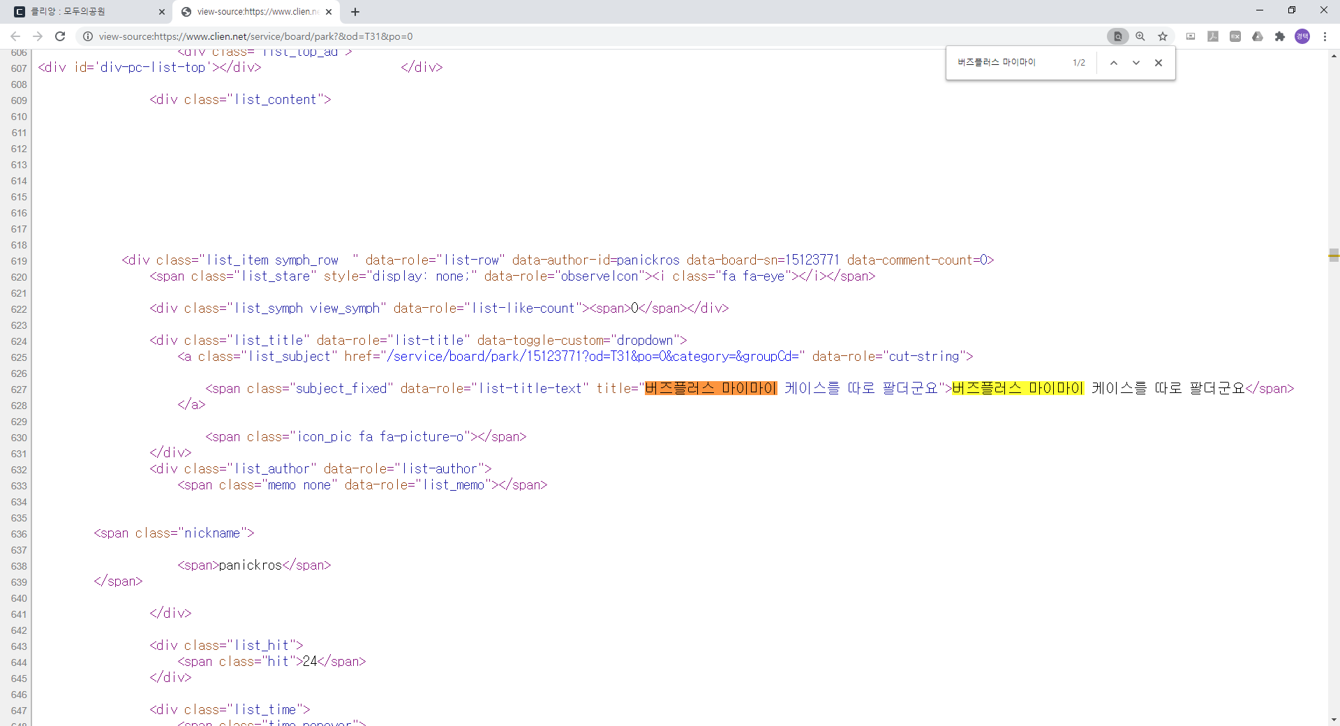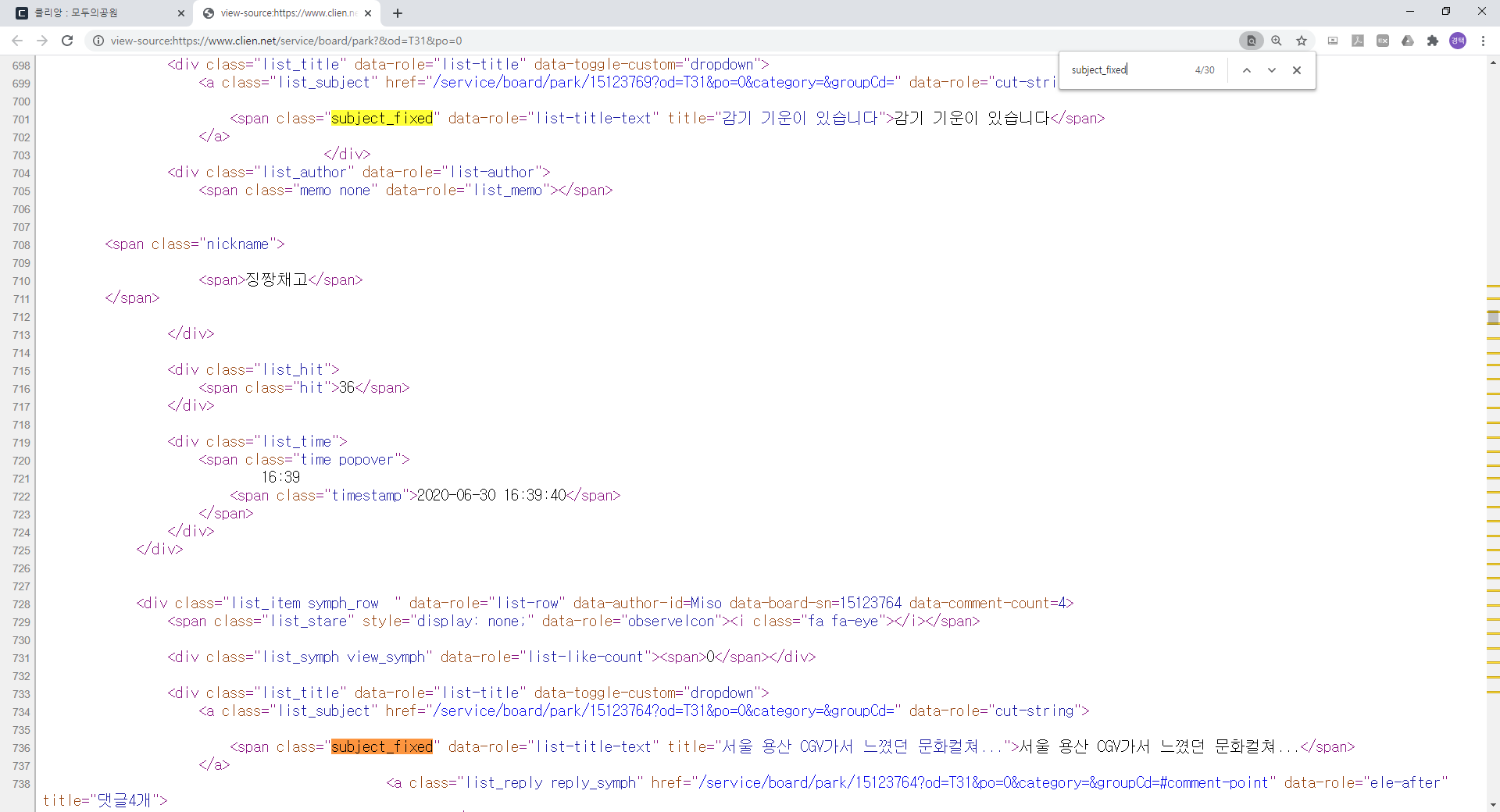 그리고 페이지 소스 보기 화면에서 Ctrl + F 를통해서 아까 복사했던 부분을 찾아냅니다.