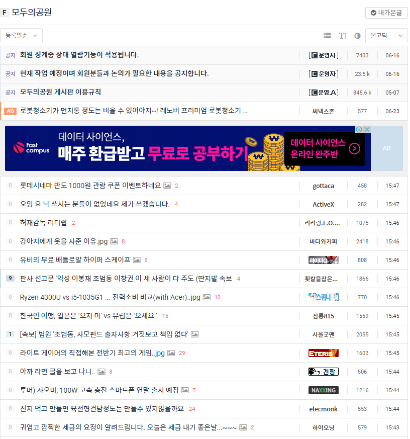 대부분의 게시판형 커뮤니티가 마찬가지이지만, 아래화면처럼 현재 주소에는 제목, 글쓴이, 조회수, 날짜 등이 나와있고 제목을 클릭하면 안의 게시글을 볼수가 있죠.