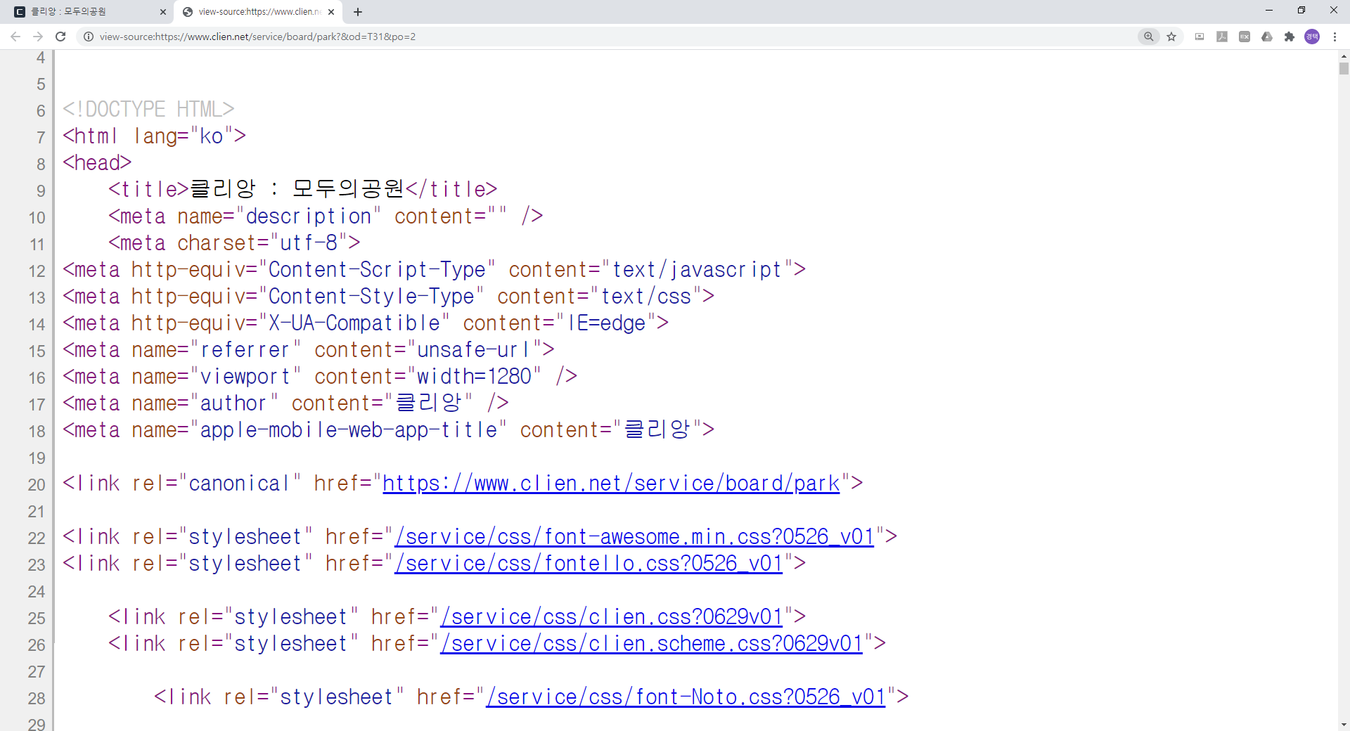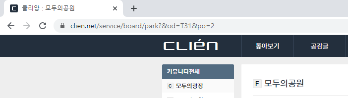 그럼 주소가 "https://www.clien.net/service/board/park?&od=T31&po=1" 로 바뀌는 것을 확인 할 수 있죠.