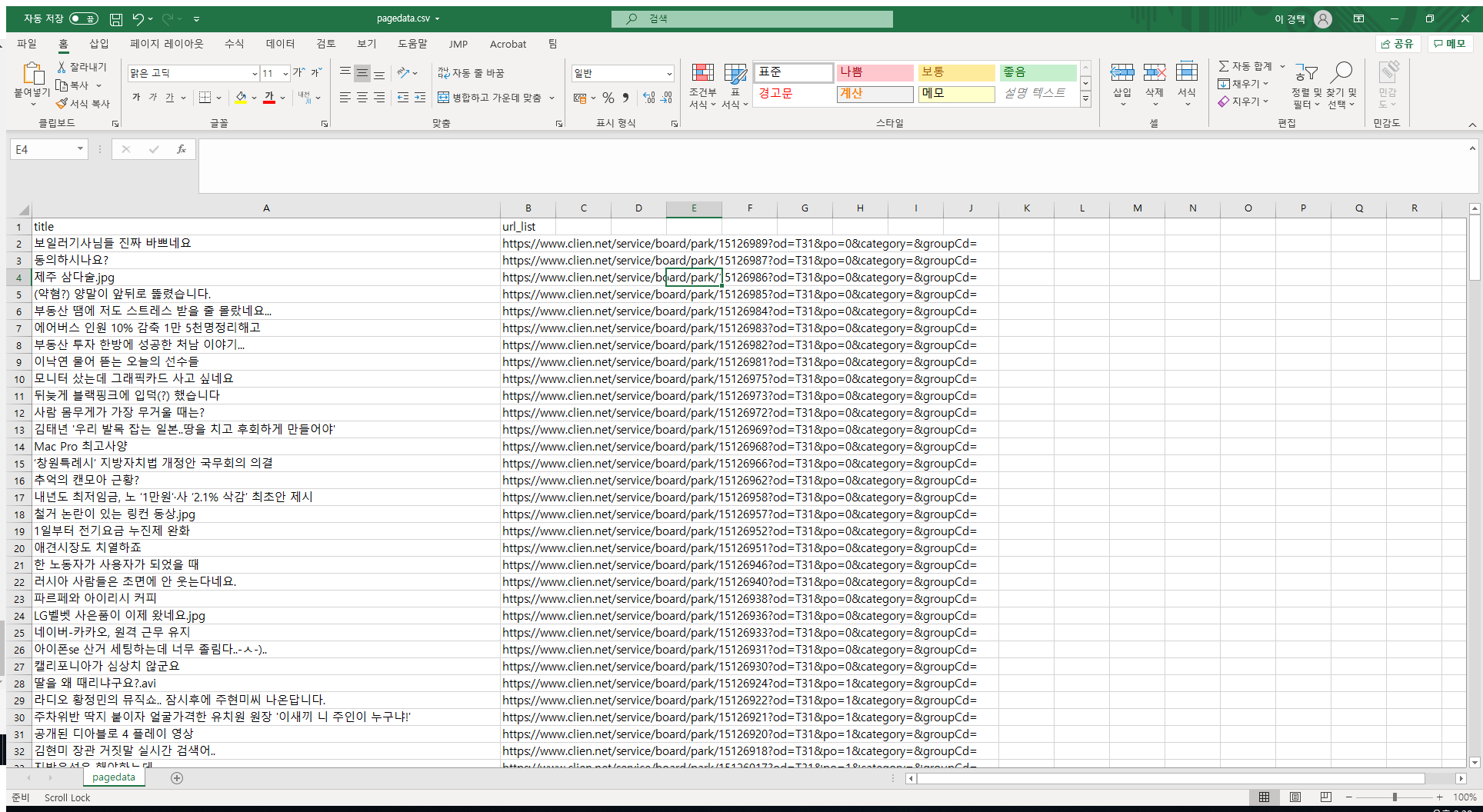 이렇게 우리는 클리앙 커뮤니티의 1페이지부터 10페이지 게시글의 제목과 url수집을 완료하였습니다.