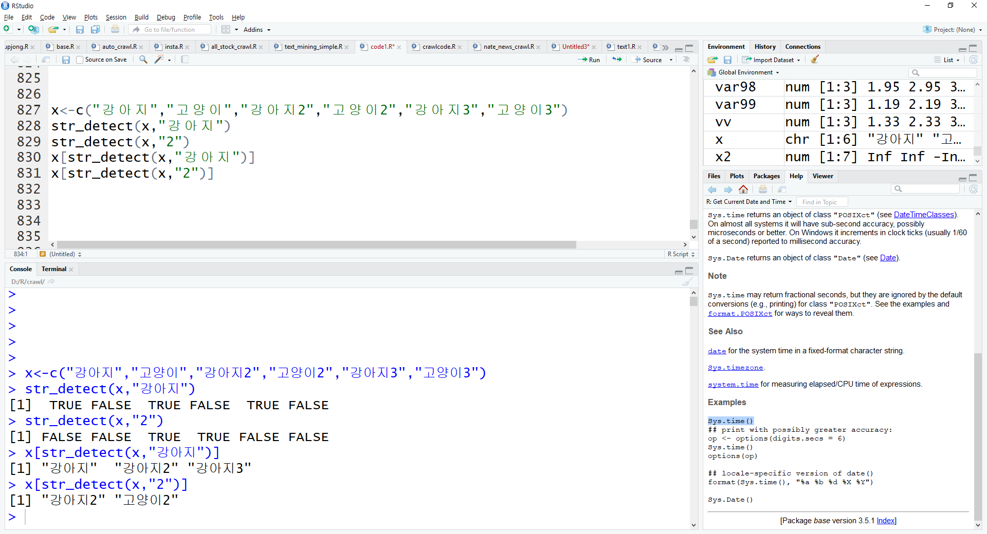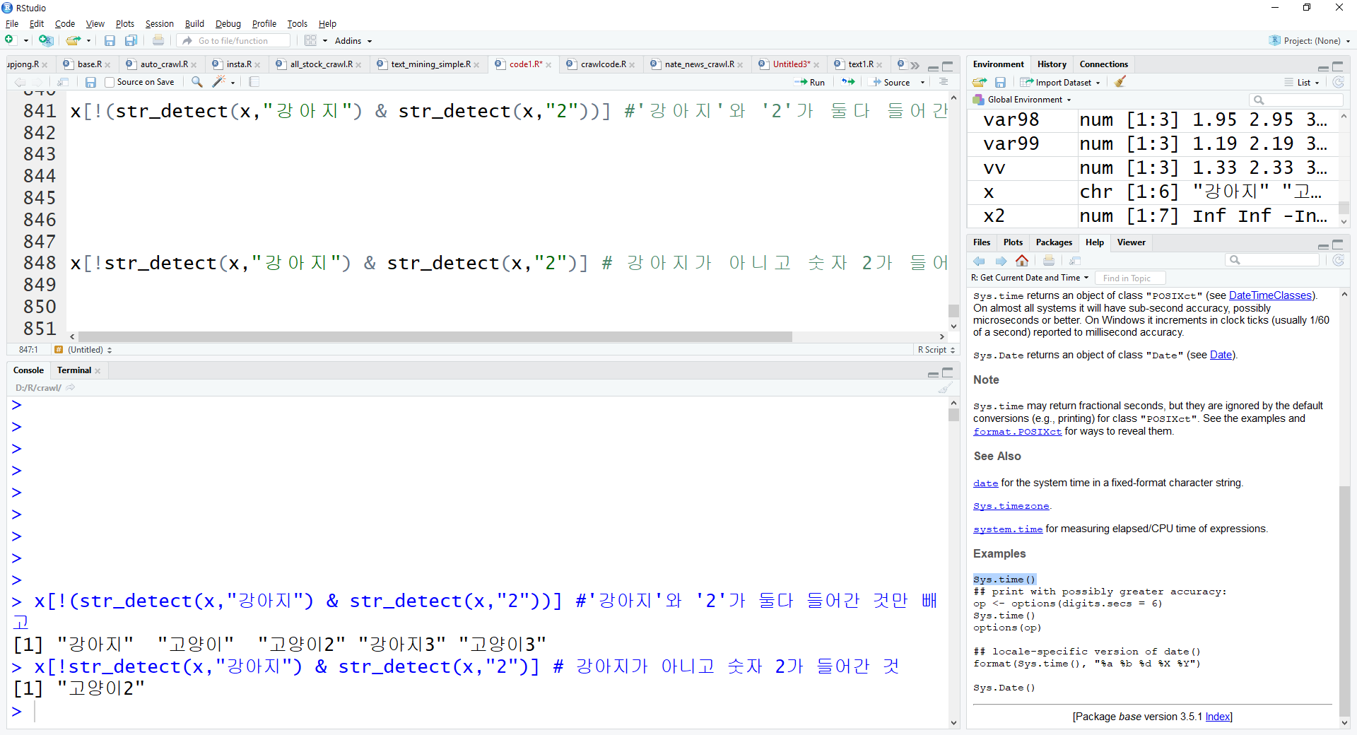 x[str_detect(x,"강아지") | str_detect(x,"2")]