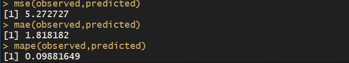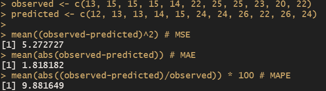 mean(abs((observed-predicted)/observed)) * 100 # MAPE