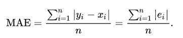 이 단점을 보완하기 위해서 나온 지표가 mean absolute error(MAE)와 mean absolute percentage error(MAPE)입니다. 수식은 각각 아래와 같습니다. MAE는 오차들의 평균 절대값이고, MAPE는 오차들을 실제값에 나누어서 백분위값으로 만든 지표입니다. MAE보다도 MAPE가 더 직관적이다라는 것을 알 수 있습니다. MAPE가 10%가 나왔다라고 하면, 실제값에서 +- 10%정도의 오차가 나는 구나 라는 것을 알 수 있습니다.
