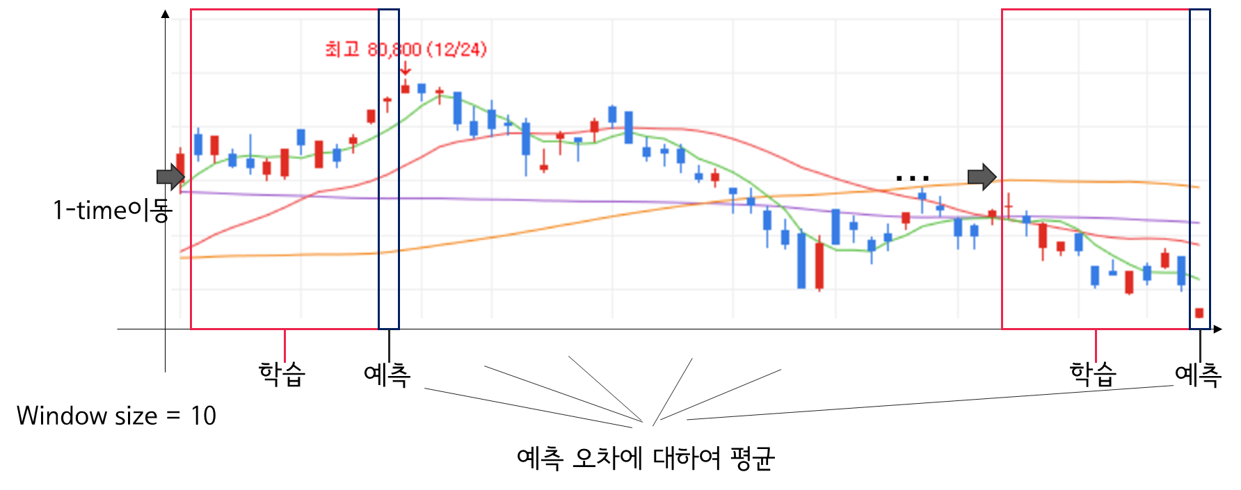 그리고 아래 그림처럼 1 time을 이동시켜서 2번째 데이터부터 11번째 데이터까지 학습을 시키고 12번째 데이터를 예측한다. 이를 데이터의 끝까지 반복하고, 모든 예측치에 대하여 오차를 구하고 평균을 낸다. 그러면 전 구간에 대하여 우리모델의 주식 예측 정확도를 구할 수 있다. 물론, 주식이라는 것은 변수가 많고, 상승 하락장마다 예측 성공률이 다를 것이기 때문에, 구간별로 예측 정확도를 보여준다면 조금 더 신뢰도를 높일 수 있을 것이다.