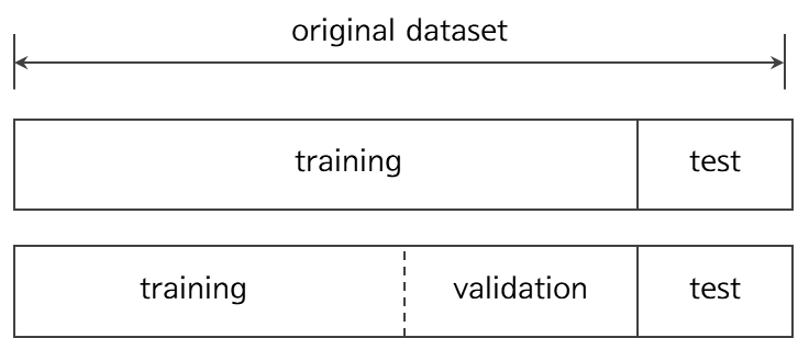 그러나 이는 데이터가 매우 많고 이상적인 상황인 경우에 해당하는 이야기이며, 데이터가 많지 않은 경우에는 학습/테스트만 (7:3, 8:2, 9:1의 비율로) 나누기도 한다. 결국 모델에 영향을 끼치는 것은 데이터의 수이기 때문에, 학습 데이터를 많이 늘리면 늘릴수록 모델의 성능은 자연스럽게 높아진다. 우리가 학습, 테스트의 데이터를 9:1의 비율로 나누었다고 가정을 해보자. 우리는 10회 또는 20회 이상 반복하여 평균 성능을 측정할 수 있다. 통계적으로 실험을 하는 횟수를 높이면 모든 관측치는 한번 이상씩 학습 데이터로 사용되고 테스트 데이터로 사용될 확률이 높아진다. 이를 확정적으로 수행하기 위한 방법이 k-fold 교차 검증(k-fold cross validation)이다.