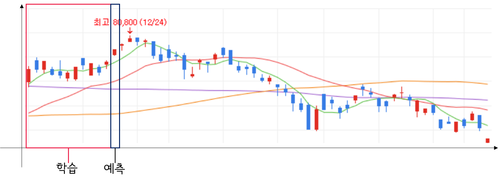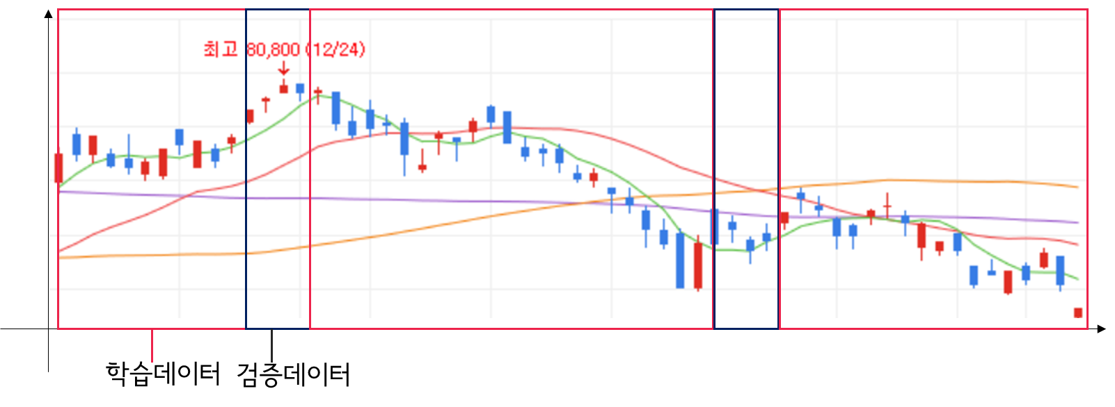 우선, 전체 구간을 랜덤하게 8:2로 나누게 되면 모델을 학습할 때에 미래 정보가 들어가게 된다. 아래 그림처럼 (단순한 상황을 가정하였다) 빨간색이 학습데이터, 파란색이 검증 데이터라고 할 때, 검증 데이터를 예측하는게 무의미하다. 그 이유는, 미래의 주식을 가지고 과거를 예측한 꼴이 되기 때문이다. 혹자는 각각의 관측치를 독립적으로 만들면 되지 않느냐 라고 생각 할 수 있지만, 아무리 관측치를 독립으로 만들려고 해도 관측치끼리의 상관관계는 남을 수 밖에 없고, 이미 주식이라는 것 자체가 미래값에는 과거의 값이 반영되어 있기 때문에 무의미하다. 즉, 시계열 데이터를 다룰때 이와 같이 실험설계를 하면 무의미한 결과가 나온다. 이렇게 실험 설계를 하면 일반적으로 성능은 잘 나온다. 미래데이터로 과거를 예측했기 때문에 당연한 결과이다. 하지만 그 결과는 신뢰 할 수 없으며 실제로 쓸수 없는 모델이라는 것을 알아두자.