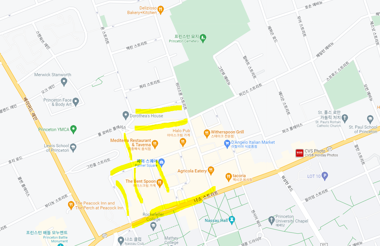 프린스턴 대학 앞 쪽에도 물론 Street parking이 가능하긴 하지만, 차들이 오고가는 와중에 빠르게 주차하지 못한다면 등에서 식은 땀이 날것이 분명하다... 더불어 이곳은 당연히 인기 있는 곳이라 주말에는 자리가 없다고 봐도 된다.