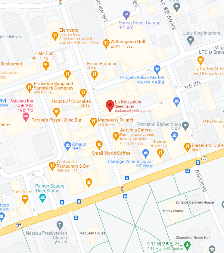 프린스턴 대학에 놀러가서 뭘 먹을까 하다가 눈에 보이는 곳에 들어가기로 했다. 프린스턴 정문 근처 La Mezzaluna라는 곳을 방문했다. 이탈리안 레스토랑이다. (인생 양고기, 프린스턴 대학을 가보면 꼭 들리길 권장한다)