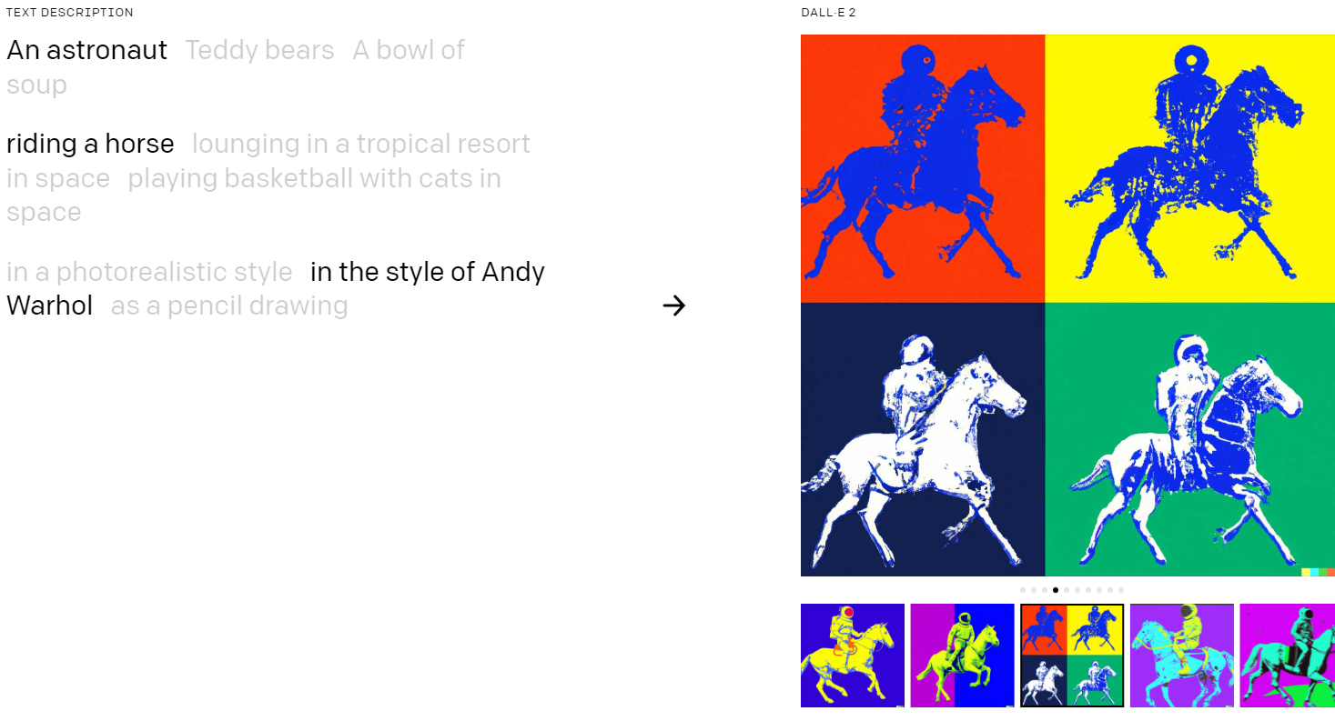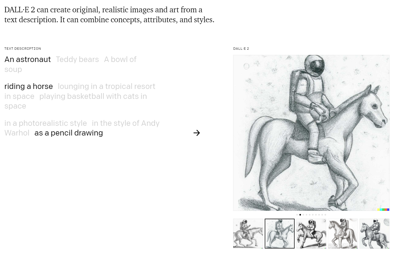 우선 달리의 성능 부터 보도록 하겠습니다. 아래 그림은 달리 공식 홈페이지에 나와있는 예시입니다. 연필로 그린 우주 비행사가 말타고 있는 모습을.. 인공지능 모델이 생성한 것입니다. AI를 공부하지 않은 사람들이 보기엔 잘 못느끼실 수도 있지만, AI를 공부하는 사람들 입장에서는 엄청나고 엄청난 성능이라는 것을 알 수 있습니다. 초기 생성 모델(5년 전)은 숫자 손글씨 하나 생성하기도 어려웠고, 사람 얼굴을 생성하면 일그러지기 일쑤였습니다. 그런데, 점차 발전하더니 고화질의 이미지를 생성하고, 사람과 같이 느껴지는 텍스트를 생성하고, 이제는 텍스트로부터 그에 맞는 이미지를 생성하기에 이르렀습니다.