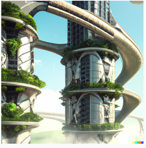 'Ten futuristic towers with a skybridge covered in lush foliage, digital art'