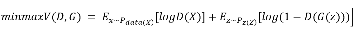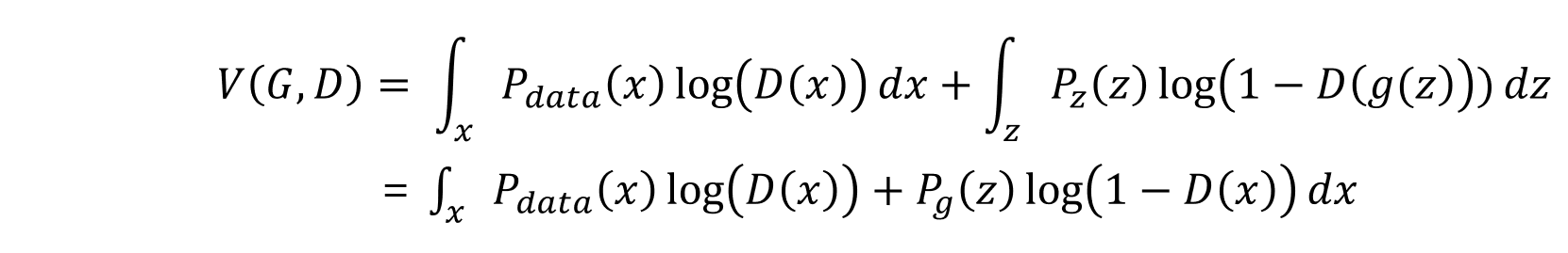 GAN은 D와 G에 대하여 다음과 같은 value function을 minimax problem으로 풀게 됩니다.