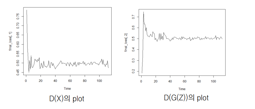 - Generator를 학습시킬 때에는 D(G(z))가 1이 되도록 학습시킴