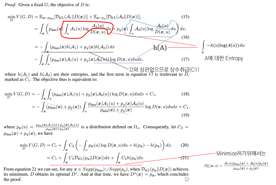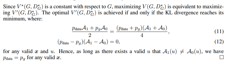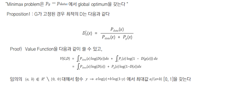 더불어, vanilla GAN의 loss function에 대한 증명은 다음과 같이 진행 할 수 있습니다. G를 고정시킨 이후 최적의 D값을 찾은 이후, 최적의 D값으로 대체한후 최적의 G를 찾아 Pg와 Pdata가 같아지는 지점이 loss funciton의 global optimum이다 라는 것을 증명합니다.