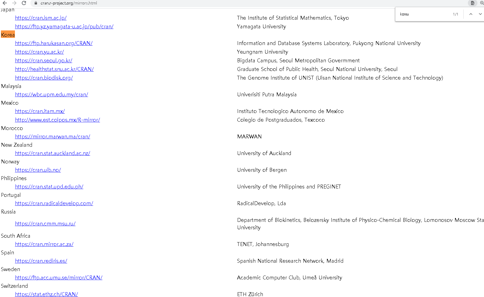 R은 아래 주소에서 Korea를 검색하신 후 아무 cran이나 설치하셔도 상관없습니다.