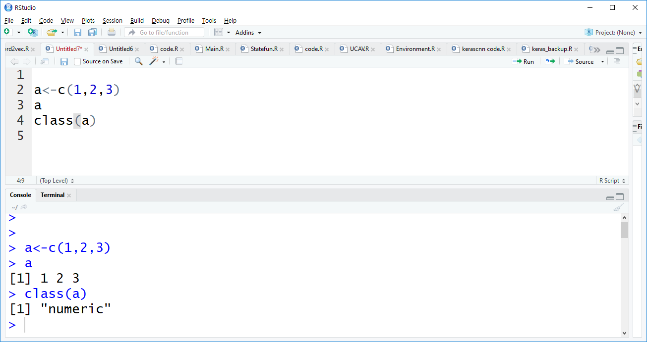 a<-c(1,2,3) ## 1,2,3 숫자를 하나의 칼럼으로 묶어서 a라는 변수에 넣어라 라는 코드입니다.