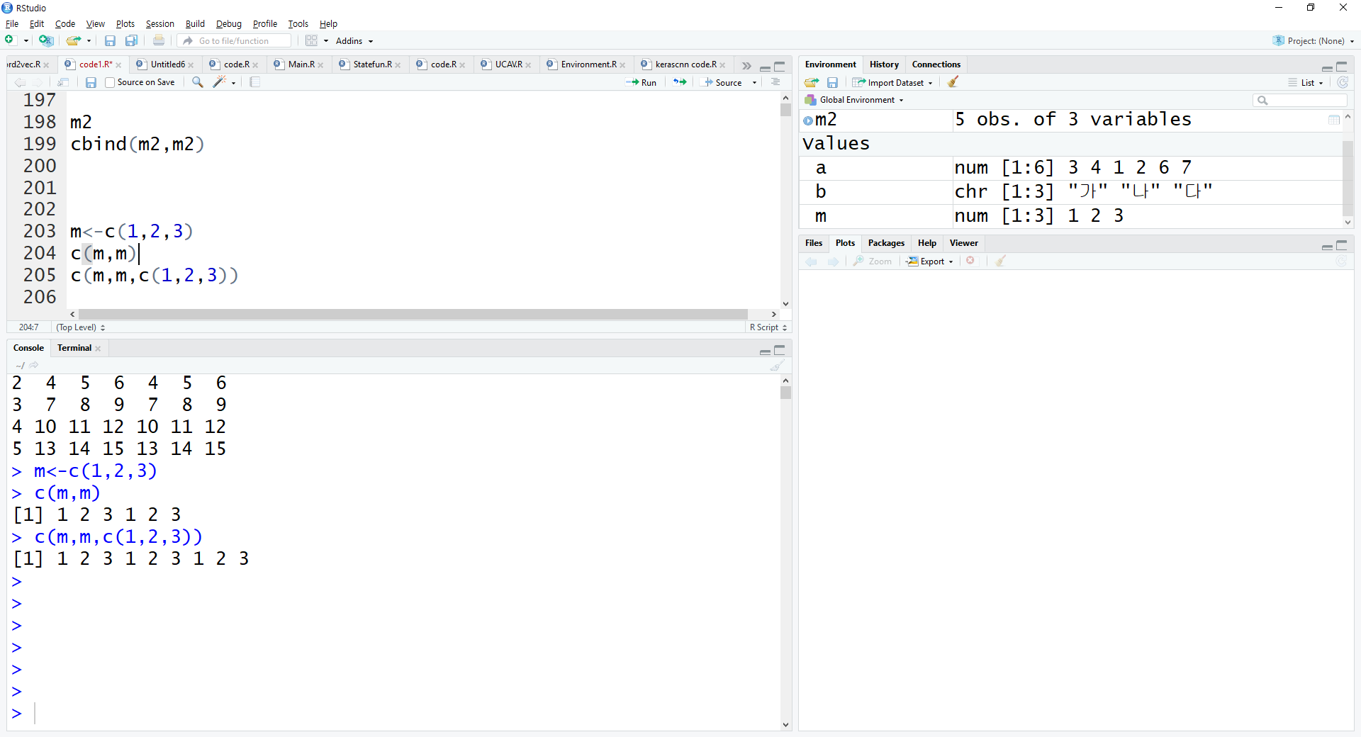 rbind는 행렬 형태의 요소 c는 벡터에만 적용된다는 점을 기억하고 계셔야 합니다.