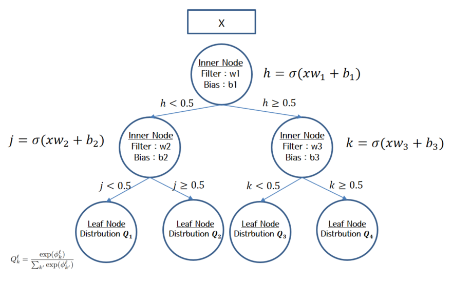 1)에 대한 내용은 모델을 일반적인 Decision Tree처럼 예측시키겠다는 이야기입니다. 위 그림에서 Q1을 선택할 경로 확률은 (1-h)*(1-j)이고 Q4를 선택할 경로 확률은 h * k 입니다. 어떤 데이터가 들어왔을 때 leaf node가 가지는 경로확률이 max인 Leaf node의 모델을 선택해서 분류하고 그 분류에 대한 설명은 path를 거쳐왔던 각 inner node의 filter가 된다는 이야기입니다.