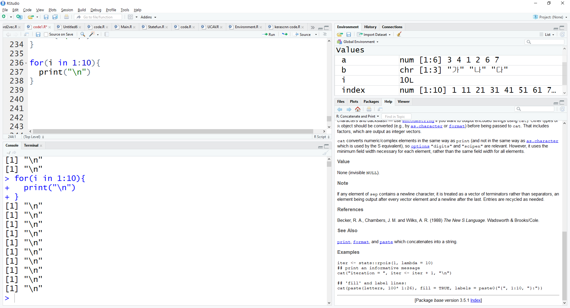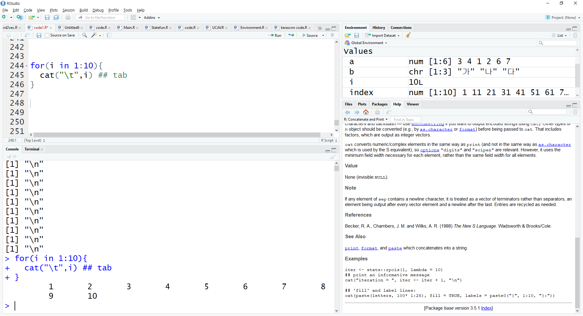즉 cat을 사용하게 되면 "n"이라는 문자가 아니라 R에서 enter능력을 가지고 있는 'n'을 쓰게 해주는 것입니다.