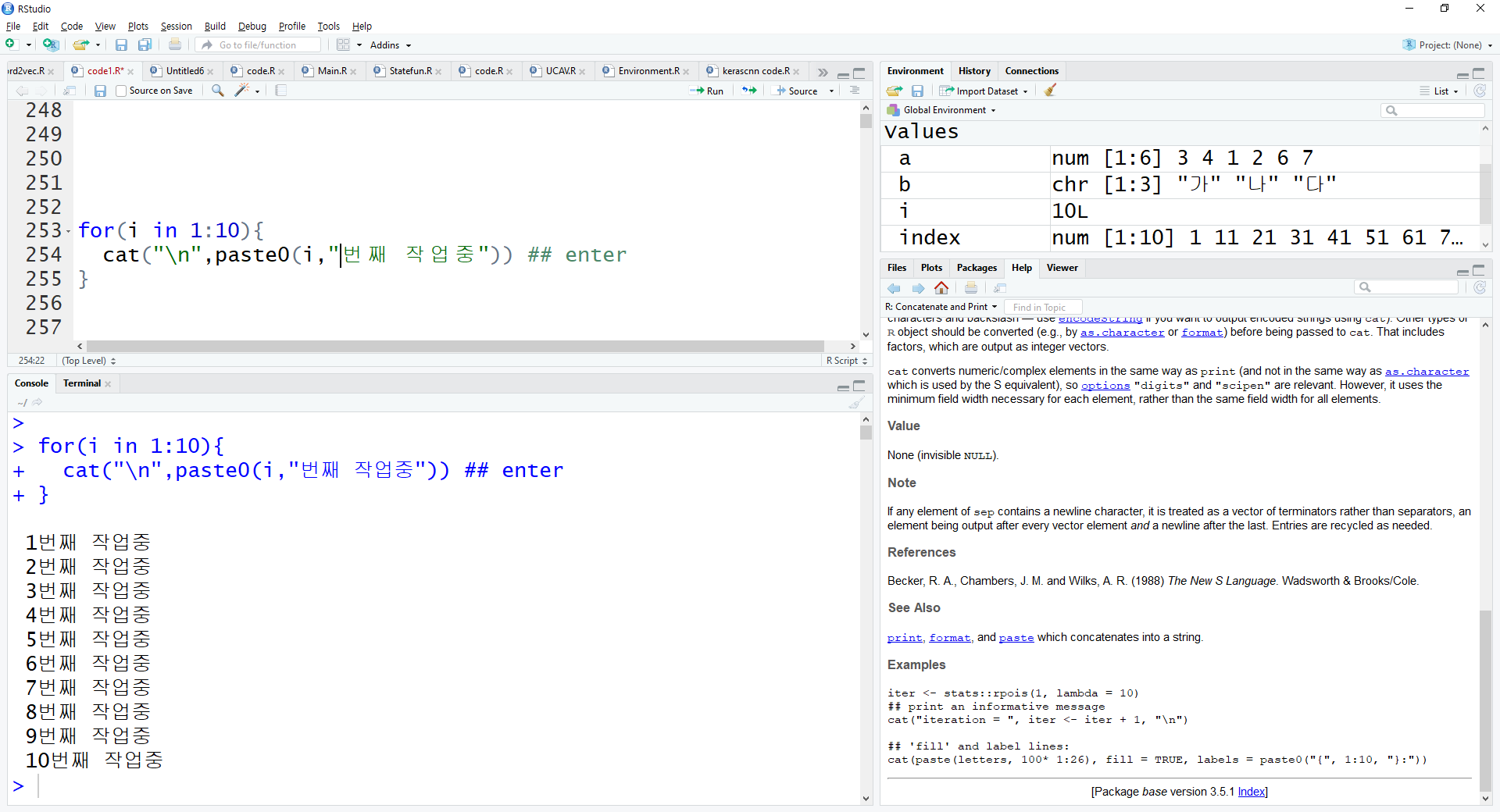 cat("\n",paste0(i,"번째 작업중")) ## enter