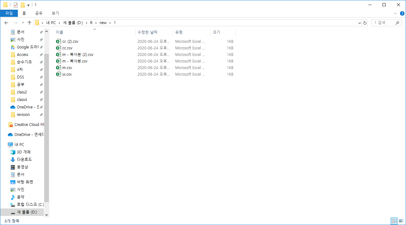 이번에는 하나의 폴더안에 있는 여러 csv파일들을 R로 불려들여서 하나로 합쳐보는 코드를 작성해보겠습니다. 우선 임의의 폴더안에 여러개의 csv파일들을 복사해서 붙여넣었습니다. R이 익숙치