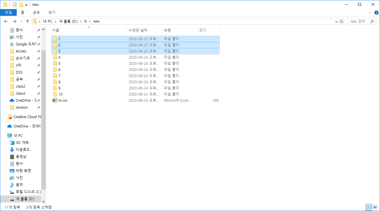 아래 화면고 같이 new폴더안에 1, 2, 3 폴더가 있다라고 가정을 하고