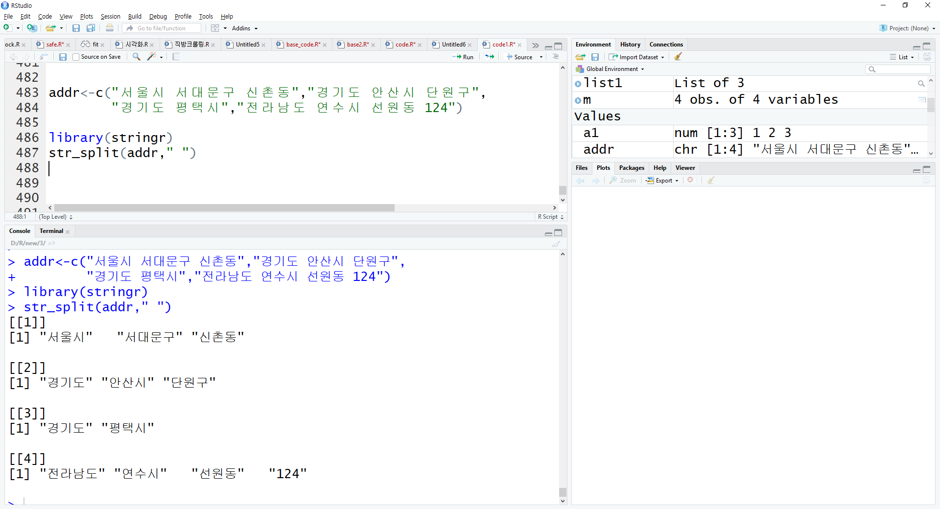 c("서울시 서대문구 신촌동","경기도 안산시 단원구", "경기도 평택시","전라남도 연수시 선원동 124")