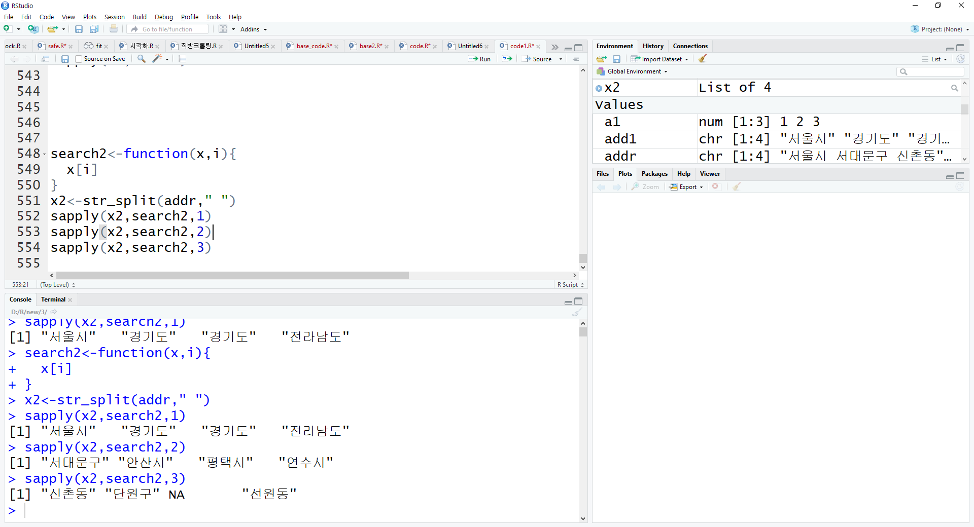 addr<-c("서울시 서대문구 신촌동","경기도 안산시 단원구",
