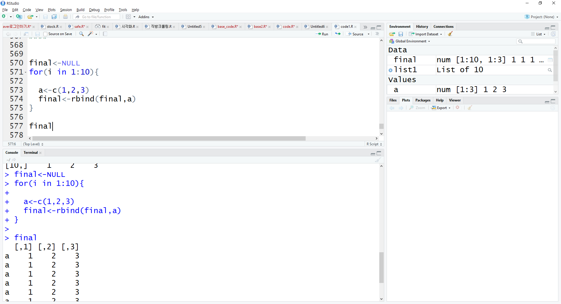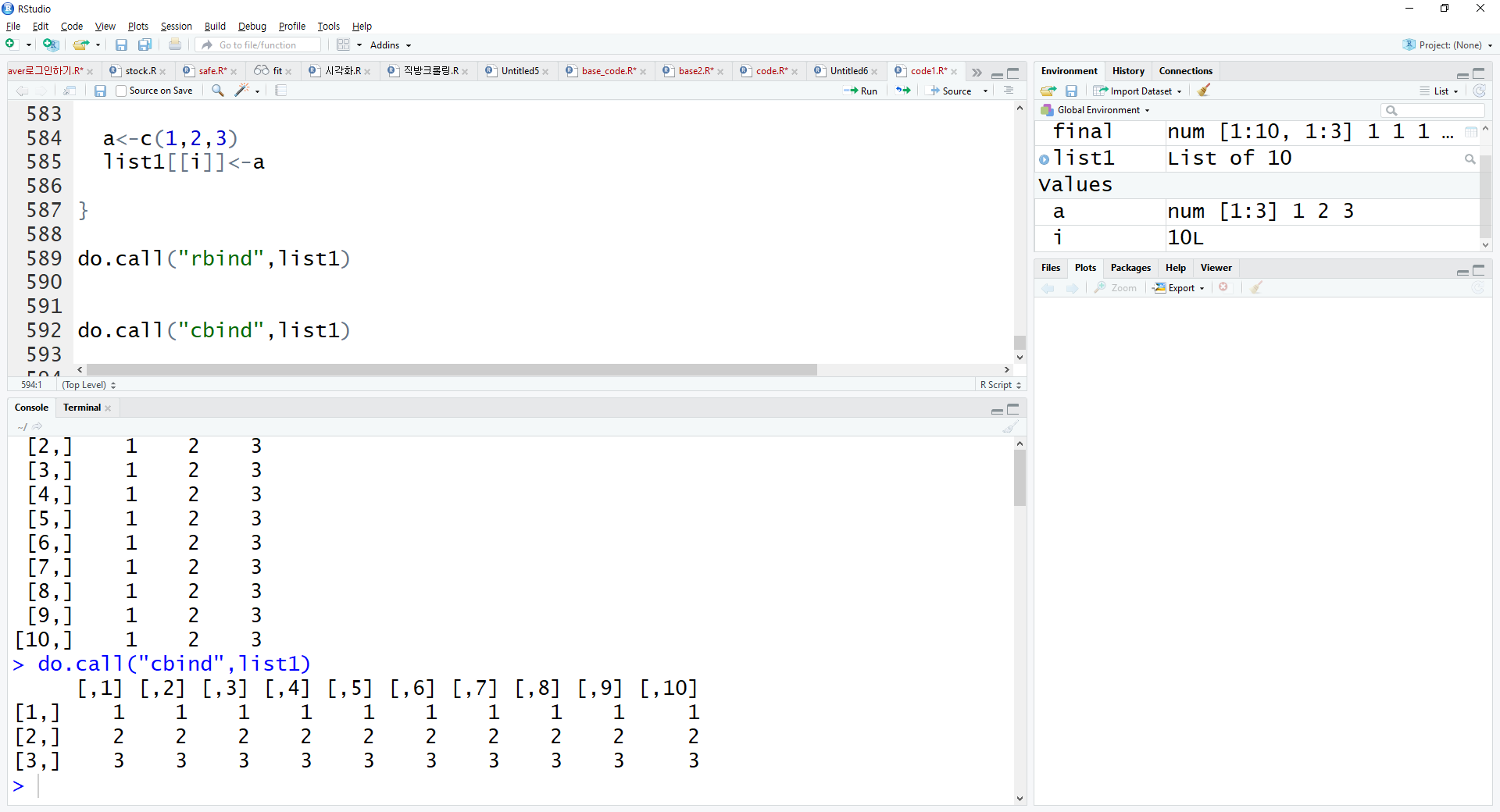 for문이 끝난 다음에 do.call("rbind", list객체) 를 통해 list안에 있는 큰 방들에대해 rbind를 시킵니다.